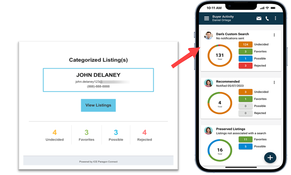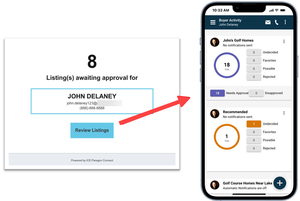 In Paragon Connect, agents receive an Agent Preview Listing Approval email that displays the number of changes at the top of the page and highlights contact details. Click the Review Listings button for instant access to approve or decline new listings in the client’s search.