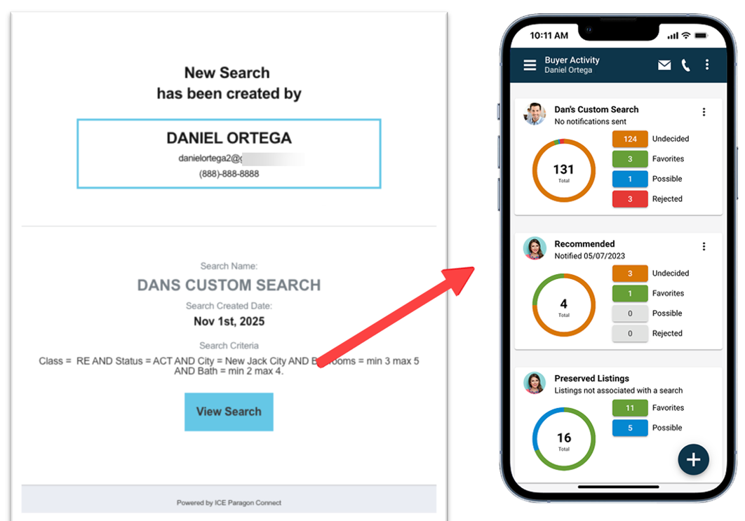 When a contact creates or modifies a search, it triggers a standalone email containing the contact’s details, name, and full search criteria. Click the view search button for instant access.